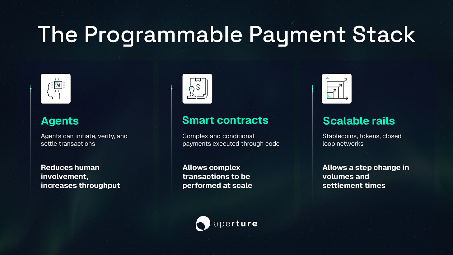 Adding autonomy takes this further. Software agents can initiate, verify, and settle payments within defined limits. This removes the bottleneck of human oversight at each step while maintaining critical checks at the design and audit stages. Combined with scalable infrastructure, agentic layers can dramatically increase transaction volume. One person could oversee a million payments per day rather than a few thousand. With the addition of programmable money, markets for small, complex, or conditional payments become viable. Payments increasingly occur continuously and invisibly, embedded in processes rather than triggered manually.