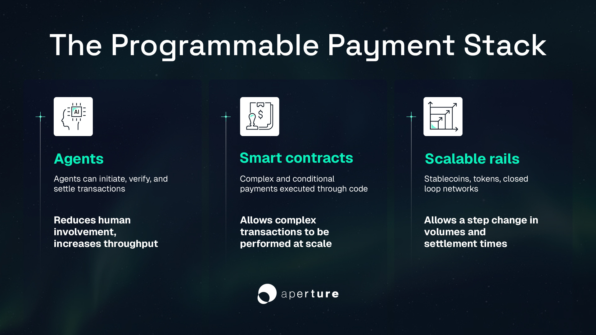 The scale and scope of modern financial flows demand standards. Open protocols and shared frameworks, familiar from the internet (TCP, HTTP, SMTP), allow multiple actors to participate without permission or bespoke integration. Tokenization and autonomous agents make low-value, high-frequency transactions feasible for the first time, while embedding compliance and governance directly into infrastructure. Combined, these innovations reduce friction, enable continuous settlement, and make payments predictable and transparent, laying the foundation for universal operators.