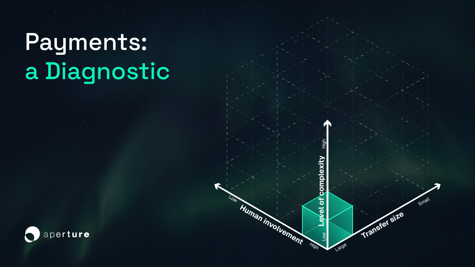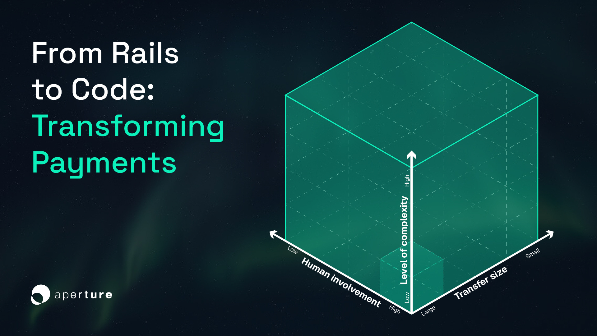 To understand how payments are evolving, it helps to visualize electronic payments along three dimensions: (i) the size of the transfer, (ii) the level of complexity, and (iii) the degree of human involvement. One axis runs from large to small amounts. Another runs from simple one-step transfers to those with many rules or parties or jurisdictions involved. The third runs from human control to autonomous systems.