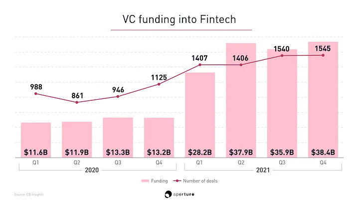 That is a large prize to shoot for, with technology change providing the opening, and venture capital providing the fuel — and so new fintech company creation accelerated, along with valuations, until we got into bubble territory.