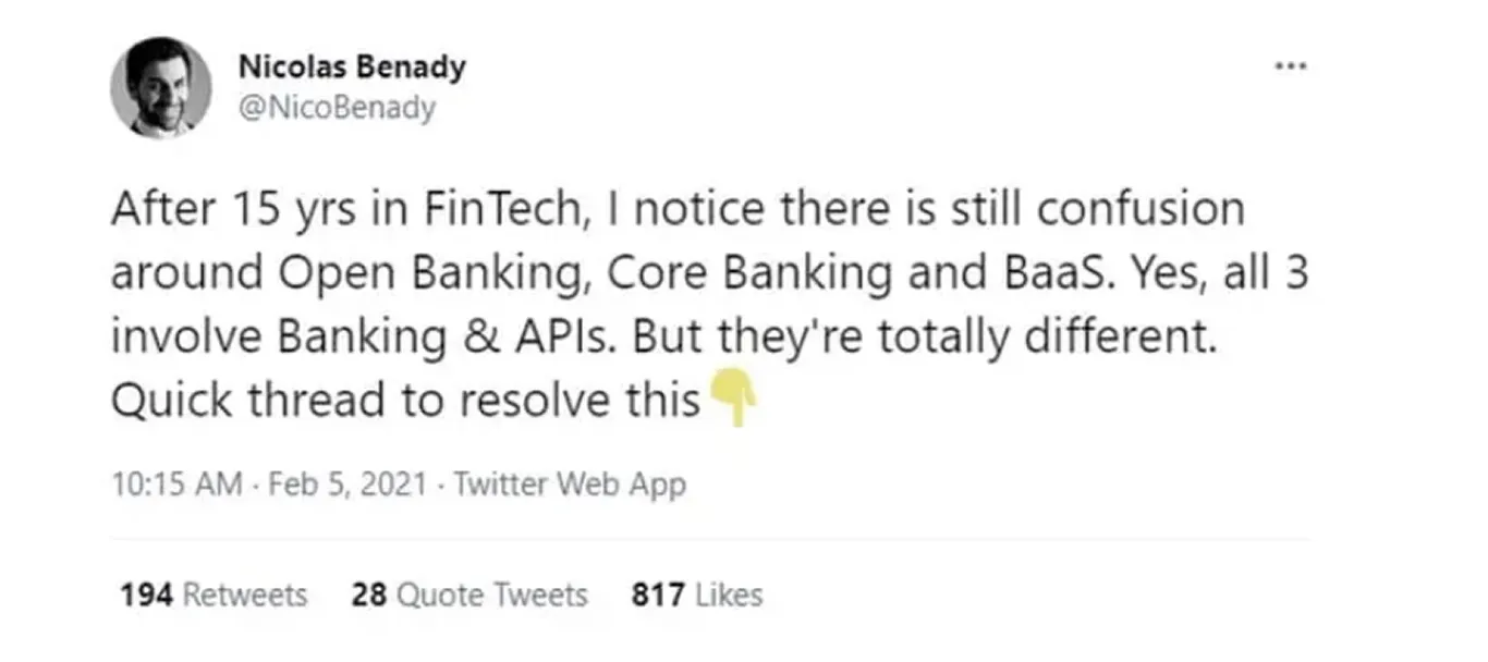 I came across this impressive twitter thread a few weeks ago from Nicolas Benady, who runs a new Banking-as-a-Service (BaaS) platform called Swan. It explains why BaaS, Core Banking and Open Banking solutions are totally different.