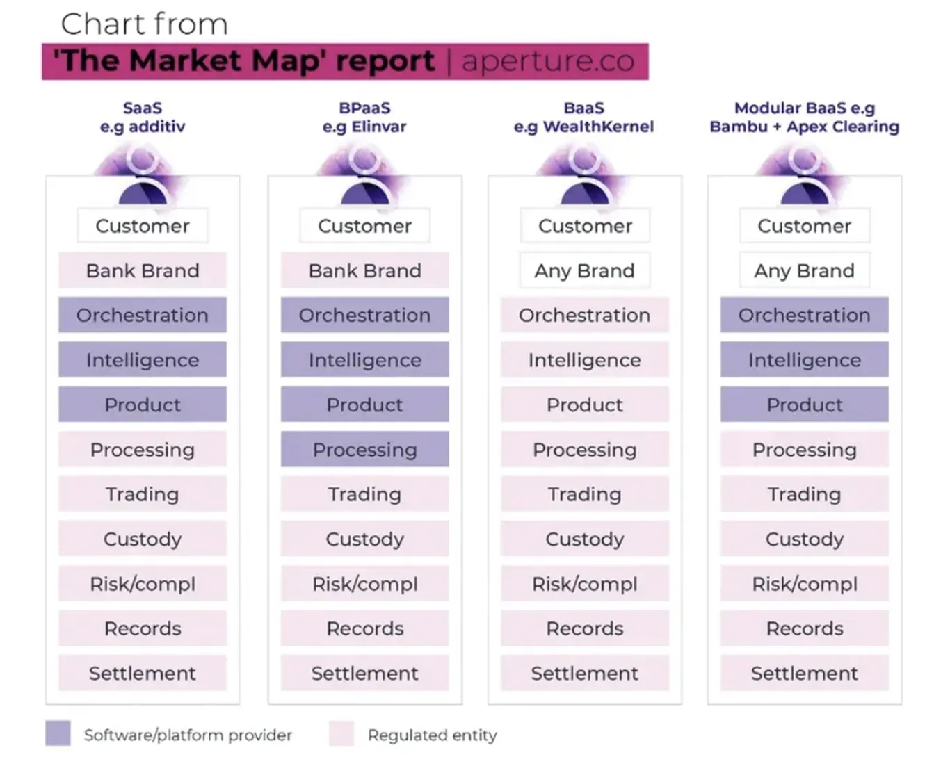Consider the graphic below, which relates to the wealth management market. On the left-hand side, we illustrate a B2B SaaS system of intelligence, in this case additiv for wealth management. additiv provides wealth managers with software that enables them to manage the customer relationship independently of the core banking system and independently of distribution channels, but the software is mostly used by single institutions in a vertically integrated business. Elinvar has the same proposition as additiv, except it also offers some business processing outsourcing. Next is WealthKernel, mentioned earlier, an end-to-end vertically integrated BaaS platform. Then, we have an example of a modular, BaaS platform: Bambu GO. The interesting point to note here is that Bambu’s main business is being a SaaS provider to regulated firms, such as Standard Chartered, providing its solution in the service of an integrated business model, just as additiv does. The offering provided by Bambu doesn’t change, just the end customer (now not a regulated entity, but fintech or consumer brand) and the provider of regulated services (a partner, rather than the end customer).